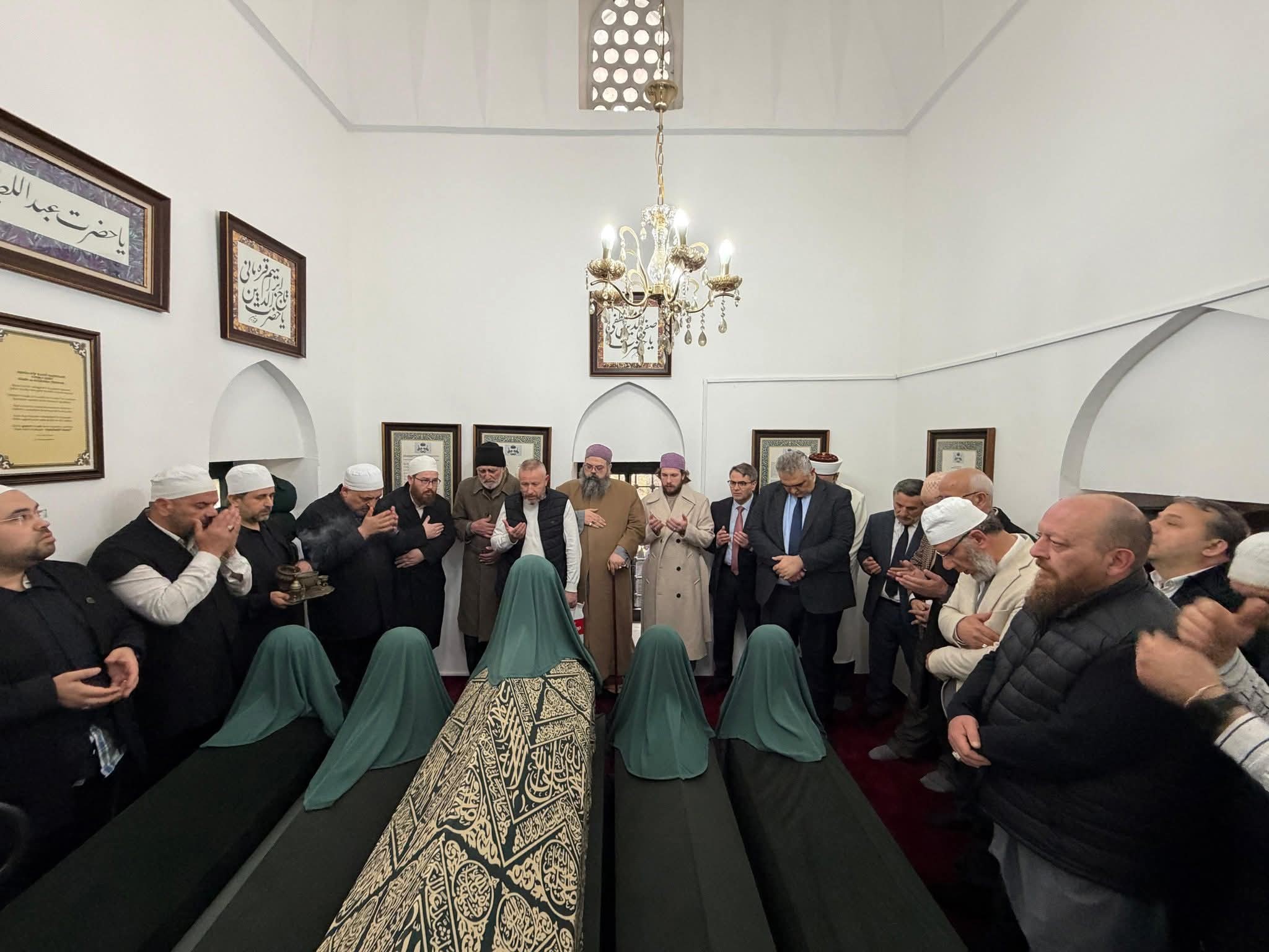 Hattat Mahmut Şahin, türbe içerisinde medfun bulunan büyük zatların isimlerini, celi ta’lik ve celî şîkeste ta’lik yazı nev’i ile kaleme aldıktan sonra ta’lik, şîkeste ta’lik ve dîvânî yazı nevilerini kendisinden öğrendiği hocası Prof. Dr. Ali Alparslan’a rahmet niyaz etti.
