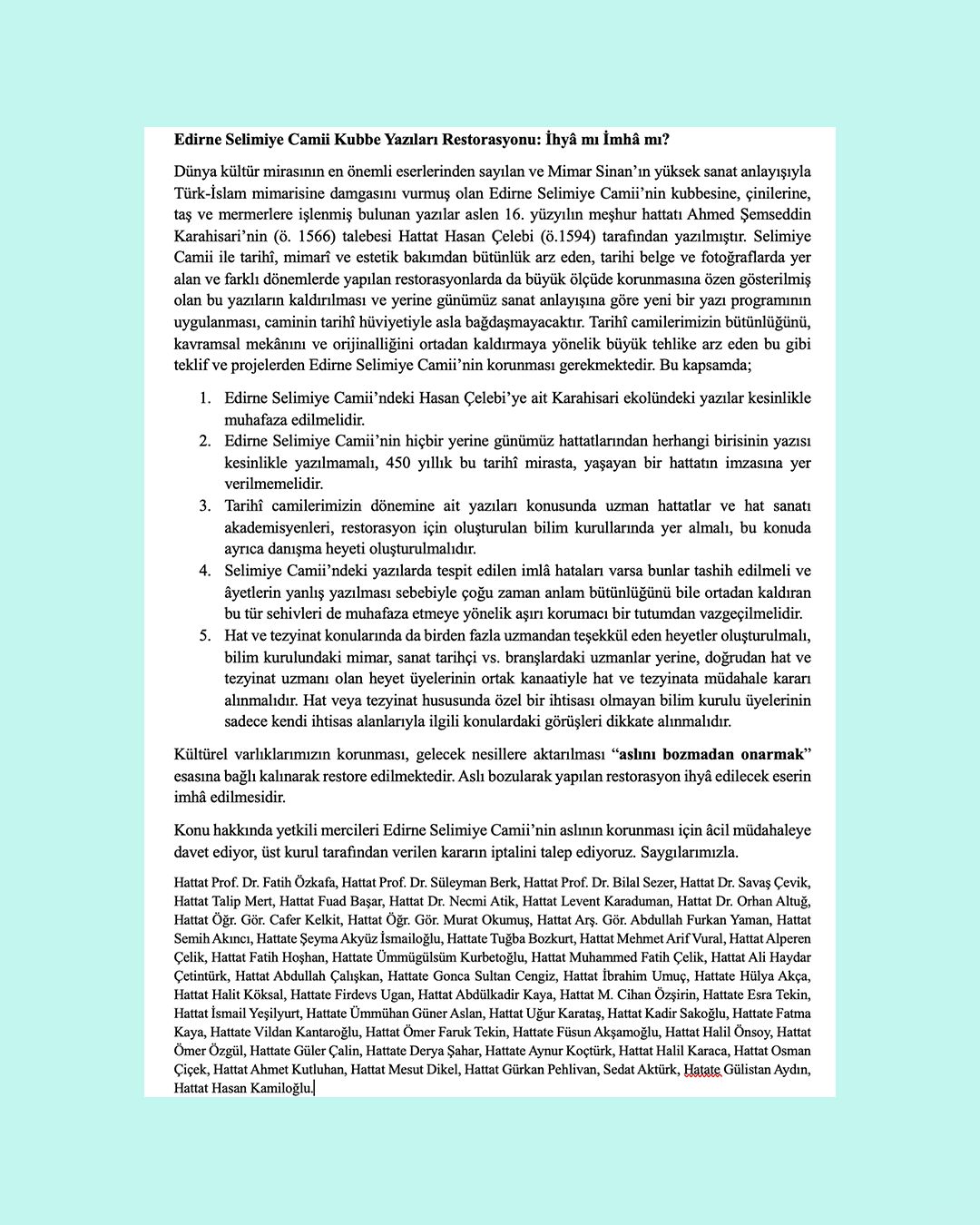 Hattatların ortak bildirisi, Selimiye Camii’nde gündeme gelen yazı değişikliklerinin Türkiye’de sanat ve kültür çevrelerinde büyük tartışma teşkil edeceğinin ilk işareti olarak görülüyor.