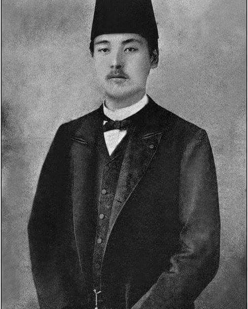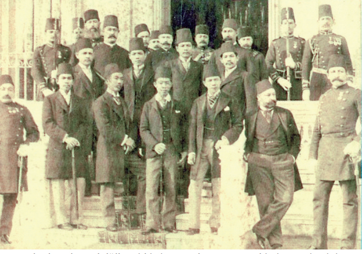 1894 yılında Sultan Abdülhamid’i ziyaret eden Prens Fushimi ve maiyetinin fesli Osmanlı kıyafetleriyle çekilmiş nadir görülen fotoğrafı. Sol başta karenin kenarında kalmış olan zat, ünlü ressamımız Şeker Ahmed Paşa’dır.