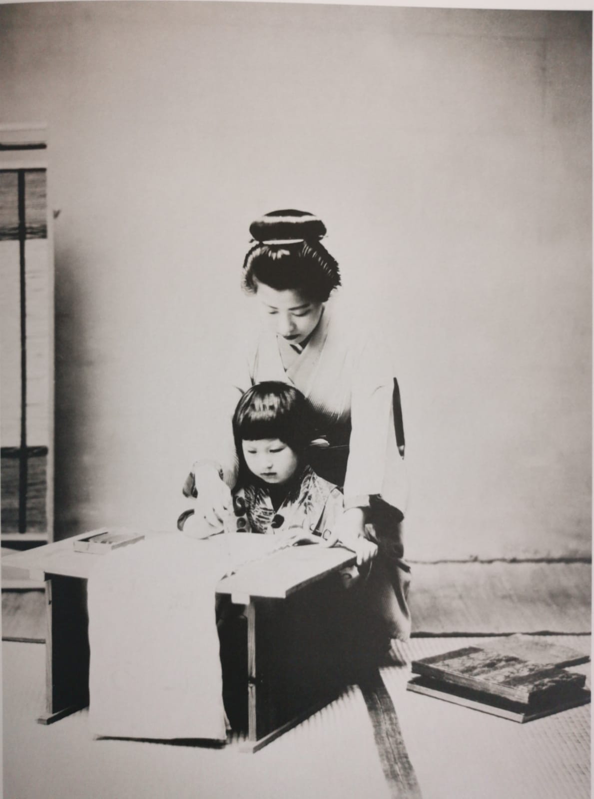 Japon anne çocuğuna evde yazma dersi veriyor.