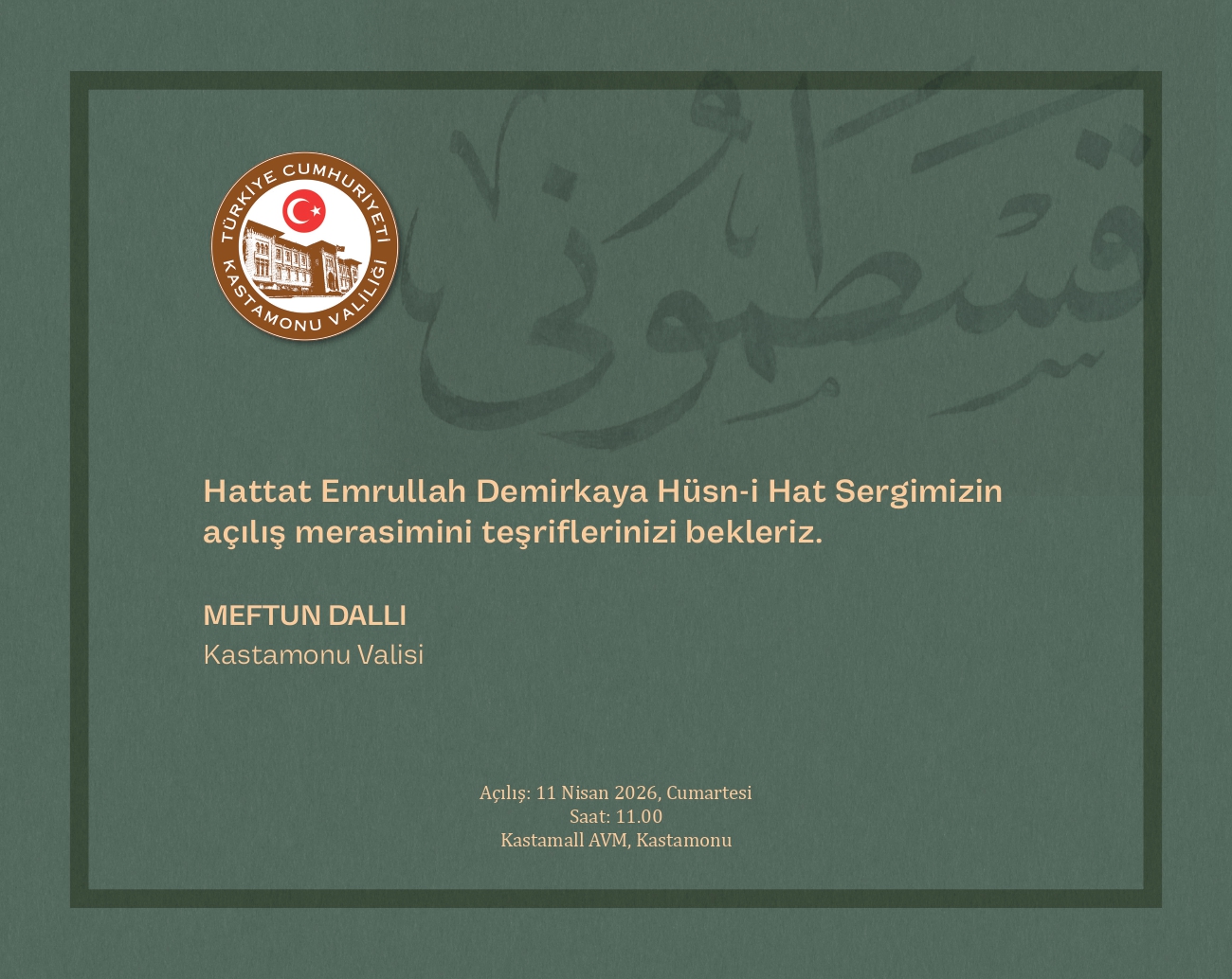 Kastamonu Valisi Sayın Meftun Dallı’nın teşrifleriyle açılışı gerçekleştirilecek olan sergi, klasik hat sanatının inceliklerini, estetik derinliğini ve irfan köklerini Kastamonulu Hattat Emrullah Demirkaya’nın eserleri özelinde günümüzle buluşturmayı hedefliyor.