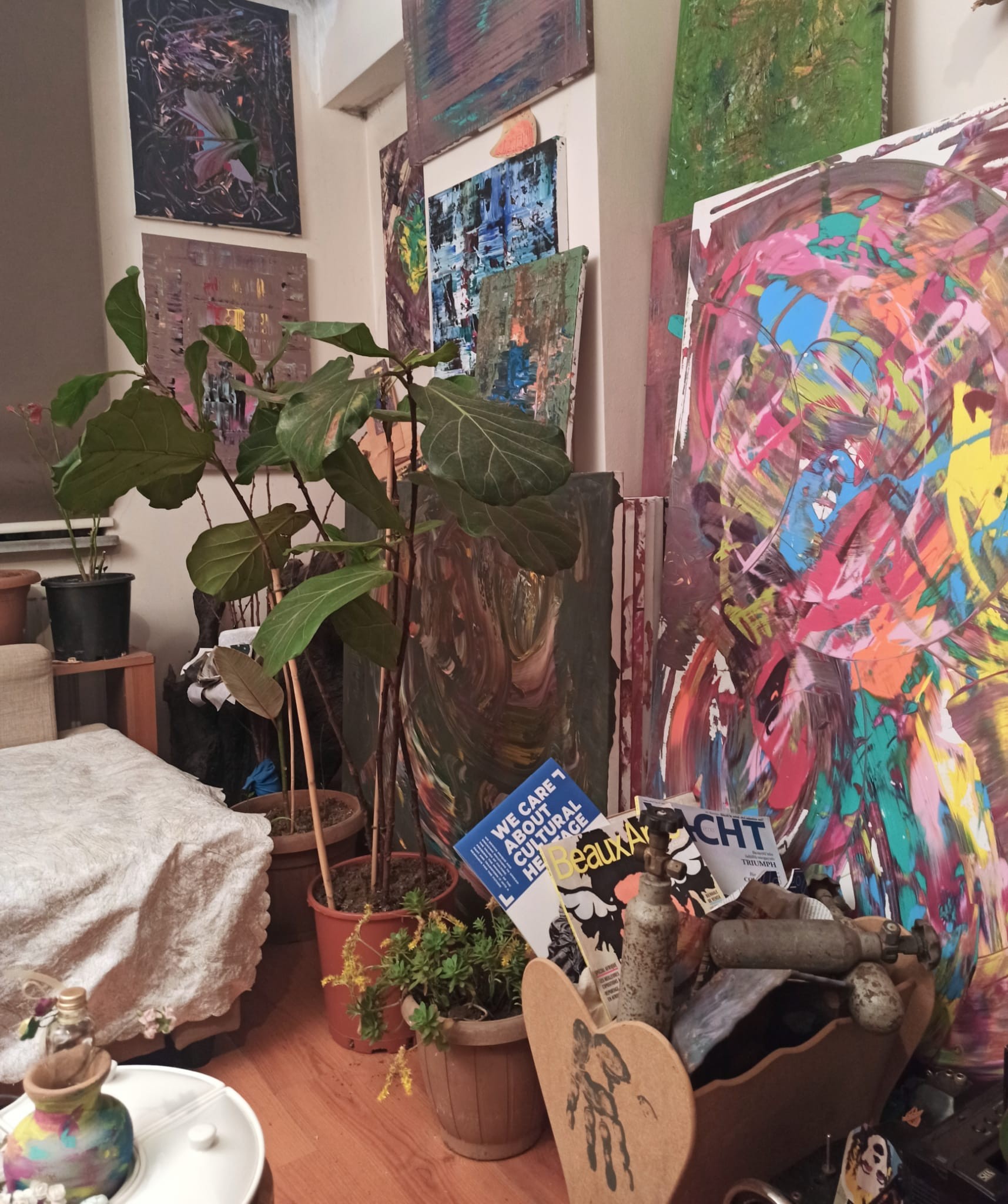 Zaman zaman ziyaret ettiğim atölyesinde yalnızca fırça ve boya yok; ahşap, metal, cam, sedef ve eski mobilya parçaları da vardır. “Atık yoktur; yalnızca henüz yeni anlamını bulmamış malzeme vardır.” Bu anlayışla eserleri, bir resim olmanın ötesinde, hayat döngüsünün yeni halkasına dönüşür.