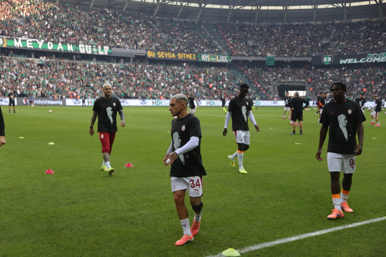 Galatasaraylı futbolcular maç öncesinde de Atatürk baskılı tişörtlerle ısındı.